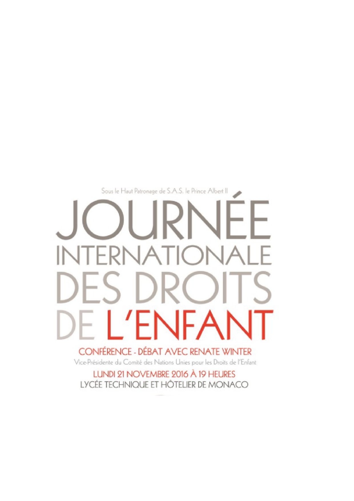 A l’occasion de la « Journée Internationale des Droits de l’Enfant 2016 » S.E.B. Soutien Entraide Bénévolat et les dix autres Associations Humanitaires Monégasques du Collectif des Associations Pour le Droit de l’Enfant « CAP DE » seront présentes le lundi 21 novembre 2016 à 19 h au Lycée Technique et Hôtelier de Monaco pour une conférence débat en présence de Mme Renate Winter Juge International, vice-présidente du Comité des Nations Unies pour les Droits de l’Enfant, ancien Juge auprès de la Cour Spéciale pour la Sierra Léone, afin de sensibiliser les élèves de Monaco à la situation des enfants dans le monde.